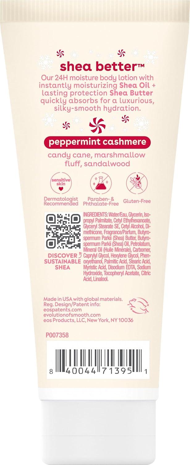 Bring the chill of the season to your skincare routine with eos Shea Better 24H Moisture Peppermint Cashmere Mini Body Lotion. This bright yet cozy scent features crisp peppermint, whipped vanilla, and sweet cream blended with rich sandalwood for a merry, refreshing twist. Now in a compact mini size, it’s perfect for travel, gifting, or tossing in your holiday bag. Packed with 7 skin-loving oils and butters, this dermatologist-recommended lotion provides 24-hour moisture and a silky-soft finish with no greasy residue, just merry and moisturized skin on the go.